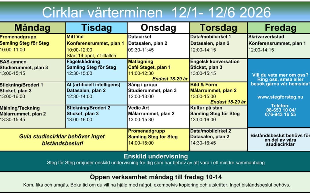 Nu är det åter dags att anmäla sig till våra cirklar och vi välkomnar gamla och nya deltagare till Steg för Stegs vårtermin (se bifogat schema).