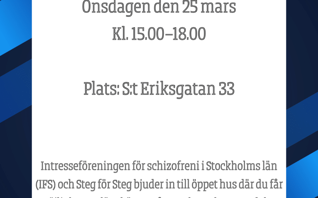 Intresseföreningen för schizofreni i Stockholms län (IFS) och Steg för Steg bjuder in till öppet hus där du får möjlighet att lära känna våra verksamheter, ta del av information om diagnosen schizofreni och höra personer med egen erfarenhet av schizofreni som delar med sig.